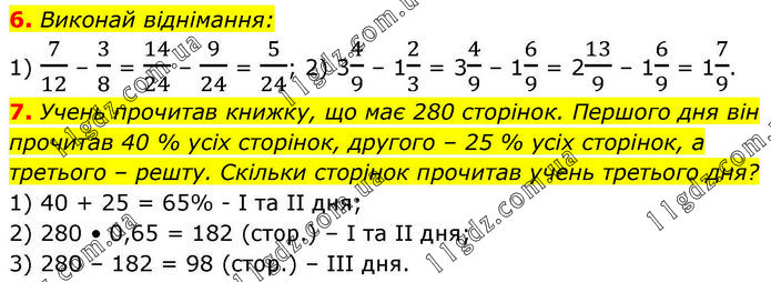 6. Виконай віднімання: 1) 7/12 – 3/8 = 14/24 – 9/24 = 5/24; 2) 34/9 – 12/3 = 34/9 – 16/9 = 213/9 – 16/9 = 17/9. 7. Учень прочитав книжку, що має 280 сторінок. Першого дня він прочитав 40 % усіх сторінок, другого – 25 % усіх сторінок, а третього – решту. Скільки сторінок прочитав учень третього дня? 1) 40 + 25 = 65% - І та ІІ дня; 2) 280 • 0,65 = 182 (стор.) – І та ІІ дня; 3) 280 – 182 = 98 (стор.) – ІІІ дня.