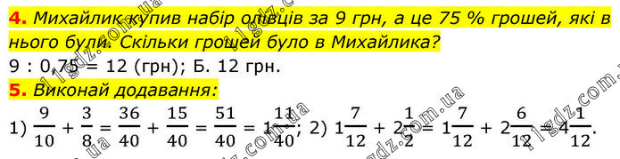 4. Михайлик купив набір олівців за 9 грн, а це 75 % грошей, які в нього були. Скільки грошей було в Михайлика? 9 : 0,75 = 12 (грн); Б. 12 грн. 5. Виконай додавання: 1) 9/10 + 3/8 = 36/40 + 15/40 = 51/40 = 111/40; 2) 17/12 + 21/2 = 17/12 + 26/12 = 41/12.