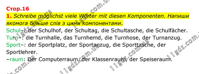 Schreibe möglichst viele Wörter mit diesen Komponenten. Напиши якомога більше слів з цими компонентами. Schul–: der Schulhof, der Schultag, die Schultasche, die Schulfächer. Turn–: die Turnhalle, das Turnhemd, die Turnhose, der Turnanzug. Sport–: der Sportplatz, der Sportanzug, die Sporttasche, der Sportlehrer. –raum: Der Computerraum, der Klassenraum, der Speiseraum.