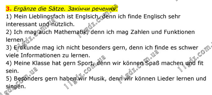 Ergänze die Sätze. Закінчи речення. 1) Mein Lieblingsfach ist Englsich, denn ich finde Englisch sehr interessant und nützlich. 2) Ich mag auch Mathematik, denn ich mag Zahlen und Funktionen lernen. 3) Erdkunde mag ich nicht besonders gern, denn ich finde es schwer viele Informationen zu lernen. 4) Meine Klasse hat gern Sport, denn wir können Spaß machen und fit sein. 5) Besonders gern haben wir Musik, denn wir können Lieder lernen und singen.