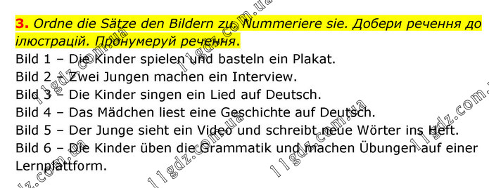 Ordne die Sätze den Bildern zu. Nummeriere sie. Добери речення до ілюстрацій. Пронумеруй речення. Bild 1 – Die Kinder spielen und basteln ein Plakat. Bild 2 – Zwei Jungen machen ein Interview. Bild 3 – Die Kinder singen ein Lied auf Deutsch. Bild 4 – Das Mädchen liest eine Geschichte auf Deutsch. Bild 5 – Der Junge sieht ein Video und schreibt neue Wörter ins Heft. Bild 6 – Die Kinder üben die Grammatik und machen Übungen auf einer Lernplattform.