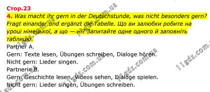 Was macht ihr gern in der Deutschstunde, was nicht besonders gern? Fragt einander und ergänzt die Tabelle. Що ви залюбки робите на уроці німецької, а що — ні? Запитайте одне одного й заповніть таблицю. Partner A. Gern: Texte lesen, Übungen schreiben, Dialoge hören. Nicht gern: Lieder singen. Partnerin B. Gern: Geschichte lesen, Videos sehen, Dialoge spielen. Nicht gern: Lieder singen, Übungen schreiben.