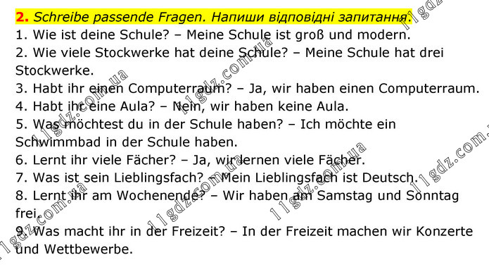 Schreibe passende Fragen. Напиши відповідні запитання. 1. Wie ist deine Schule? – Meine Schule ist groß und modern. 2. Wie viele Stockwerke hat deine Schule? – Meine Schule hat drei Stockwerke. 3. Habt ihr einen Computerraum? – Ja, wir haben einen Computerraum. 4. Habt ihr eine Aula? – Nein, wir haben keine Aula. 5. Was möchtest du in der Schule haben? – Ich möchte ein Schwimmbad in der Schule haben. 6. Lernt ihr viele Fächer? – Ja, wir lernen viele Fächer. 7. Was ist sein Lieblingsfach? – Mein Lieblingsfach ist Deutsch. 8. Lernt ihr am Wochenende? – Wir haben am Samstag und Sonntag frei. 9. Was macht ihr in der Freizeit? – In der Freizeit machen wir Konzerte und Wettbewerbe.