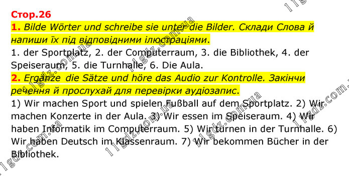 1. Bilde Wörter und schreibe sie unter die Bilder. Склади Слова й напиши їх під відповідними ілюстраціями. 1. der Sportplatz, 2. der Computerraum, 3. die Bibliothek, 4. der Speiseraum, 5. die Turnhalle, 6. Die Aula. 2. Ergänze die Sätze und höre das Audio zur Kontrolle. Закінчи речення й прослухай для перевірки аудіозапис. 1) Wir machen Sport und spielen Fußball auf dem Sportplatz. 2) Wir machen Konzerte in der Aula. 3) Wir essen im Speiseraum. 4) Wir haben Informatik im Computerraum. 5) Wir turnen in der Turnhalle. 6) Wir haben Deutsch im Klassenraum. 7) Wir bekommen Bücher in der Bibliothek.
