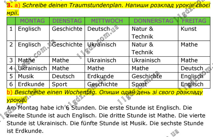 а) Schreibe deinen Traumstundenplan. Напиши розклад уроків своєї мрії. MONTAG DIENSTAG MITTWOCH DONNERSTAG FREITAG 1 Englisch Geschichte Deutsch Natur & Technik Kunst 2 Englisch Geschichte Ukrainisch Natur & Technik Mathe 3 Mathe Mathe Ukrainisch Ukrainisch Mathe 4 Ukrainisch Mathe Mathe Mathe Deutsch 5 Musik Deutsch Erdkunde Geschichte Englisch 6 Erdkunde Sport Geschichte Sport Englisch b) Beschreibe einen Wochentag. Опиши один день зі свого розкладу уроків. Am Montag habe ich 6 Stunden. Die erste Stunde ist Englisch. Die zweite Stunde ist auch Englisch. Die dritte Stunde ist Mathe. Die vierte Stunde ist Ukrainisch. Die fünfte Stunde ist Musik. Die sechste Stunde ist Erdkunde.