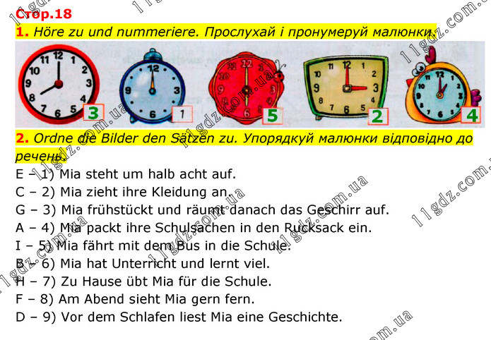1. Höre zu und nummeriere. Прослухай і пронумеруй малюнки. 2. Ordne die Bilder den Sätzen zu. Упорядкуй малюнки відповідно до речень. E – 1) Mia steht um halb acht auf. C – 2) Mia zieht ihre Kleidung an. G – 3) Mia frühstückt und räumt danach das Geschirr auf. A – 4) Mia packt ihre Schulsachen in den Rucksack ein. I – 5) Mia fährt mit dem Bus in die Schule. B – 6) Mia hat Unterricht und lernt viel. H – 7) Zu Hause übt Mia für die Schule. F – 8) Am Abend sieht Mia gern fern. D – 9) Vor dem Schlafen liest Mia eine Geschichte.