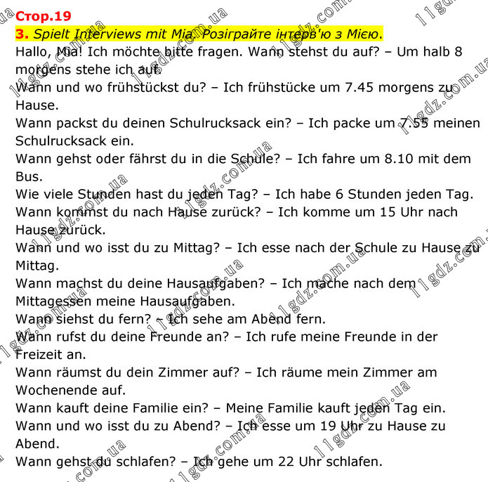 Spielt Interviews mit Mia. Розіграйте інтерв'ю з Мією. Hallo, Mia! Ich möchte bitte fragen. Wann stehst du auf? – Um halb 8 morgens stehe ich auf. Wann und wo frühstückst du? – Ich frühstücke um 7.45 morgens zu Hause. Wann packst du deinen Schulrucksack ein? – Ich packe um 7.55 meinen Schulrucksack ein. Wann gehst oder fährst du in die Schule? – Ich fahre um 8.10 mit dem Bus. Wie viele Stunden hast du jeden Tag? – Ich habe 6 Stunden jeden Tag. Wann kommst du nach Hause zurück? – Ich komme um 15 Uhr nach Hause zurück. Wann und wo isst du zu Mittag? – Ich esse nach der Schule zu Hause zu Mittag. Wann machst du deine Hausaufgaben? – Ich mache nach dem Mittagessen meine Hausaufgaben. Wann siehst du fern? – Ich sehe am Abend fern. Wann rufst du deine Freunde an? – Ich rufe meine Freunde in der Freizeit an. Wann räumst du dein Zimmer auf? – Ich räume mein Zimmer am Wochenende auf. Wann kauft deine Familie ein? – Meine Familie kauft jeden Tag ein. Wann und wo isst du zu Abend? – Ich esse um 19 Uhr zu Hause zu Abend. Wann gehst du schlafen? – Ich gehe um 22 Uhr schlafen.