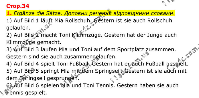 Ergänze die Sätze. Доповни речення відповідними словами. 1) Auf Bild 1 läuft Mia Rollschuh. Gestern ist sie auch Rollschuh gelaufen. 2) Auf Bild 2 macht Toni Klimmzüge. Gestern hat der Junge auch Klimmzüge gemacht. 3) Auf Bild 3 laufen Mia und Toni auf dem Sportplatz zusammen. Gestern sind sie auch zusammengelaufen. 4) Auf Bild 4 spielt Toni Fußball. Gestern hat er auch Fußball gespielt. 5) Auf Bild 5 springt Mia mit dem Springseil. Gestern ist sie auch mit dem Springseil gesprungen. 6) Auf Bild 6 spielen Mia und Toni Tennis. Gestern haben sie auch Tennis gespielt.