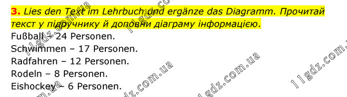 Lies den Text im Lehrbuch und ergänze das Diagramm. Прочитай текст у підручнику й доповни діаграму інформацією. Fußball – 24 Personen. Schwimmen – 17 Personen. Radfahren – 12 Personen. Rodeln – 8 Personen. Eishockey – 6 Personen.