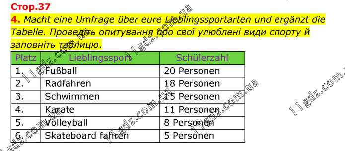 Macht eine Umfrage über eure Lieblingssportarten und ergänzt die Tabelle. Проведіть опитування про свої улюблені види спорту й заповніть таблицю. Platz Lieblingssport Schülerzahl 1. Fußball 20 Personen 2. Radfahren 18 Personen 3. Schwimmen 15 Personen 4. Karate 11 Personen 5. Volleyball 8 Personen 6. Skateboard fahren 5 Personen