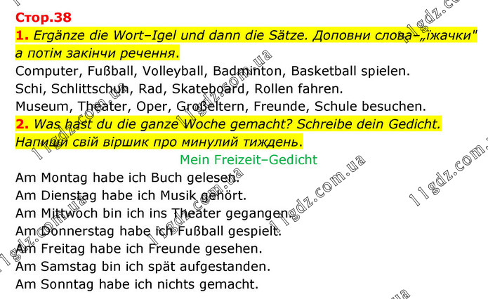 1. Ergänze die Wort–Igel und dann die Sätze. Доповни слова–„їжачки" а потім закінчи речення. Computer, Fußball, Volleyball, Badminton, Basketball spielen. Schi, Schlittschuh, Rad, Skateboard, Rollen fahren. Museum, Theater, Oper, Großeltern, Freunde, Schule besuchen. 2. Was hast du die ganze Woche gemacht? Schreibe dein Gedicht. Напиши свій віршик про минулий тиждень. Mein Freizeit–Gedicht Am Montag habe ich Buch gelesen. Am Dienstag habe ich Musik gehört. Am Mittwoch bin ich ins Theater gegangen. Am Donnerstag habe ich Fußball gespielt. Am Freitag habe ich Freunde gesehen. Am Samstag bin ich spät aufgestanden. Am Sonntag habe ich nichts gemacht.