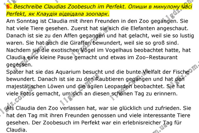 Beschreibe Claudias Zoobesuch im Perfekt. Опиши в минулому часі Perfekt, як Клаудія відвідала зоопарк. Am Sonntag ist Claudia mit ihren Freunden in den Zoo gegangen. Sie hat viele Tiere gesehen. Zuerst hat sie sich die Elefanten angeschaut. Danach ist sie zu den Affen gegangen und hat gelacht, weil sie so lustig waren. Sie hat auch die Giraffen bewundert, weil sie so groß sind. Nachdem sie die exotischen Vögel im Vogelhaus beobachtet hatte, hat Claudia eine kleine Pause gemacht und etwas im Zoo–Restaurant gegessen. Später hat sie das Aquarium besucht und die bunte Vielfalt der Fische bewundert. Danach ist sie zu den Raubtieren gegangen und hat den majestätischen Löwen und die agilen Leoparden beobachtet. Sie hat viele Fotos gemacht, um sich an diesen schönen Tag zu erinnern. Als Claudia den Zoo verlassen hat, war sie glücklich und zufrieden. Sie hat den Tag mit ihren Freunden genossen und viele interessante Tiere gesehen. Der Zoobesuch im Perfekt war ein erlebnisreicher Tag für Claudia.