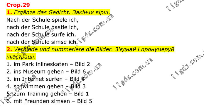 1. Ergänze das Gedicht. Закінчи вірш. Nach der Schule spiele ich, nach der Schule bastle ich, nach der Schule surfe ich, nach der Schule simse ich. 2. Verbinde und nummeriere die Bilder. З'єднай і пронумеруй ілюстрації. 1. im Park inlineskaten – Bild 2 2. ins Museum gehen – Bild 6 3. im Internet surfen – Bild 4 4. schwimmen gehen – Bild 3 5. zum Training gehen – Bild 1 6. mit Freunden simsen – Bild 5