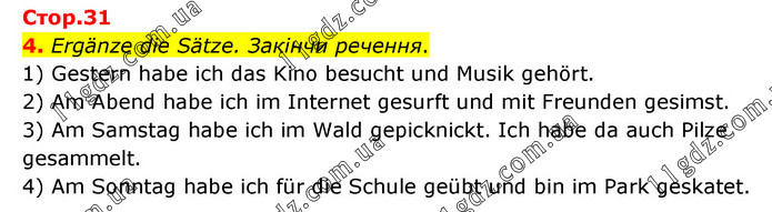 Ergänze die Sätze. Закінчи речення. 1) Gestern habe ich das Kino besucht und Musik gehört. 2) Am Abend habe ich im Internet gesurft und mit Freunden gesimst. 3) Am Samstag habe ich im Wald gepicknickt. Ich habe da auch Pilze gesammelt. 4) Am Sonntag habe ich für die Schule geübt und bin im Park geskatet.