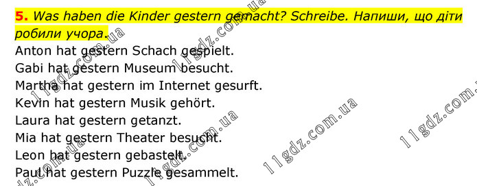Was haben die Kinder gestern gemacht? Schreibe. Напиши, що діти робили учора. Anton hat gestern Schach gespielt. Gabi hat gestern Museum besucht. Martha hat gestern im Internet gesurft. Kevin hat gestern Musik gehört. Laura hat gestern getanzt. Mia hat gestern Theater besucht. Leon hat gestern gebastelt. Paul hat gestern Puzzle gesammelt.