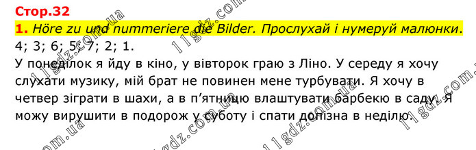 Höre zu und nummeriere die Bilder. Прослухай і нумеруй малюнки. 4; 3; 6; 5; 7; 2; 1. У понеділок я йду в кіно, у вівторок граю з Ліно. У середу я хочу слухати музику, мій брат не повинен мене турбувати. Я хочу в четвер зіграти в шахи, а в п’ятницю влаштувати барбекю в саду. Я можу вирушити в подорож у суботу і спати допізна в неділю.