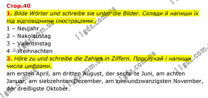 1. Bilde Wörter und schreibe sie unter die Bilder. Склади й напиши їх під відповідними ілюстраціями. 1 – Neujahr 2 – Nakolaustag 3 – Valentinstag 4 – Weihnachten 2. Höre zu und schreibe die Zahlen in Ziffern. Прослухай і напиши числа цифрами. am ersten April, am dritten August, der sechste Juni, am achten Januar, am siebzehnten Dezember, am zweiundzwanzigsten November, der dreißigste Oktober.