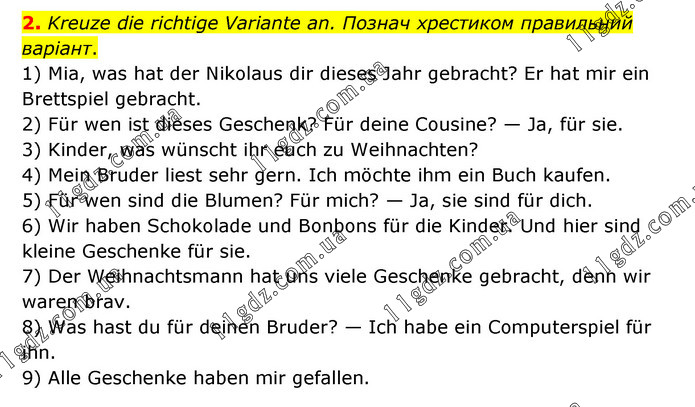 Kreuze die richtige Variante an. Познач хрестиком правильний варіант. 1) Mia, was hat der Nikolaus dir dieses Jahr gebracht? Er hat mir ein Brettspiel gebracht. 2) Für wen ist dieses Geschenk? Für deine Cousine? — Ja, für sie. 3) Kinder, was wünscht ihr euch zu Weihnachten? 4) Mein Bruder liest sehr gern. Ich möchte ihm ein Buch kaufen. 5) Für wen sind die Blumen? Für mich? — Ja, sie sind für dich. 6) Wir haben Schokolade und Bonbons für die Kinder. Und hier sind kleine Geschenke für sie. 7) Der Weihnachtsmann hat uns viele Geschenke gebracht, denn wir waren brav. 8) Was hast du für deinen Bruder? — Ich habe ein Computerspiel für ihn. 9) Alle Geschenke haben mir gefallen.