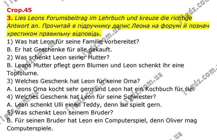 Lies Leons Forumsbeitrag im Lehrbuch und kreuze die richtige Antwort an. Прочитай в підручнику допис Леона на форумі й познач хрестиком правильну відповідь. 1) Was hat Leon für seine Familie vorbereitet? B. Er hat Geschenke für alle gekauft. 2) Was schenkt Leon seiner Mutter? B. Leons Mutter pflegt gern Blumen und Leon schenkt ihr eine Topfblume. 3) Welches Geschenk hat Leon für seine Oma? A. Leons Oma kocht sehr gern und Leon hat ein Kochbuch für sie. 4) Welches Geschenk hat Leon für seine Schwester? A. Leon schenkt Ulli einen Teddy, denn sie spielt gern. 5) Was schenkt Leon seinem Bruder? B. Für seinen Bruder hat Leon ein Computerspiel, denn Oliver mag Computerspiele.