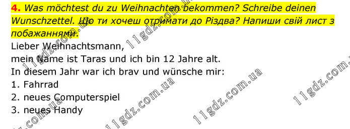 Was möchtest du zu Weihnachten bekommen? Schreibe deinen Wunschzettel. Що ти хочеш отримати до Різдва? Напиши свій лист з побажаннями. Lieber Weihnachtsmann, mein Name ist Taras und ich bin 12 Jahre alt. In diesem Jahr war ich brav und wünsche mir: 1. Fahrrad 2. neues Computerspiel 3. neues Handy