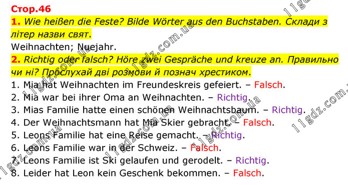 1. Wie heißen die Feste? Bilde Wörter aus den Buchstaben. Склади з літер назви свят. Weihnachten; Nuejahr. 2. Richtig oder falsch? Höre zwei Gespräche und kreuze an. Правильно чи ні? Прослухай дві розмови й познач хрестиком. 1. Mia hat Weihnachten im Freundeskreis gefeiert. – Falsch. 2. Mia war bei ihrer Oma an Weihnachten. – Richtig. 3. Mias Familie hatte einen schönen Weihnachtsbaum. – Richtig. 4. Der Weihnachtsmann hat Mia Skier gebracht. – Falsch. 5. Leons Familie hat eine Reise gemacht. – Richtig. 6. Leons Familie war in der Schweiz. – Falsch. 7. Leons Familie ist Ski gelaufen und gerodelt. – Richtig. 8. Leider hat Leon kein Geschenk bekommen. – Falsch.