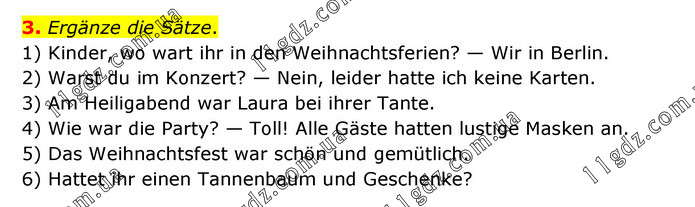 Ergänze die Sätze. 1) Kinder, wo wart ihr in den Weihnachtsferien? — Wir in Berlin. 2) Warst du im Konzert? — Nein, leider hatte ich keine Karten. 3) Am Heiligabend war Laura bei ihrer Tante. 4) Wie war die Party? — Toll! Alle Gäste hatten lustige Masken an. 5) Das Weihnachtsfest war schön und gemütlich. 6) Hattet ihr einen Tannenbaum und Geschenke?