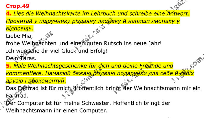 4. Lies die Weihnachtskarte im Lehrbuch und schreibe eine Antwort. Прочитай у підручнику різдвяну листівку й напиши листівку у відповідь. Liebe Mia, frohe Weihnachten und einen guten Rutsch ins neue Jahr! Ich wünsche dir viel Glück und Erfolg! Dein Taras. 5. Male Weihnachtsgeschenke für dich und deine Freunde und kommentiere. Намалюй бажані різдвяні подарунки для себе й своїх друзів і прокоментуй. Das Fahrrad ist für mich. Hoffentlich bringt der Weihnachtsmann mir ein Fahrrad. Der Computer ist für meine Schwester. Hoffentlich bringt der Weihnachtsmann ihr einen Computer.