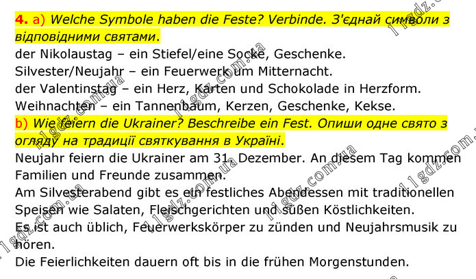 a) Welche Symbole haben die Feste? Verbinde. З'єднай символи з відповідними святами. der Nikolaustag – ein Stiefel/eine Socke, Geschenke. Silvester/Neujahr – ein Feuerwerk um Mitternacht. der Valentinstag – ein Herz, Karten und Schokolade in Herzform. Weihnachten – ein Tannenbaum, Kerzen, Geschenke, Kekse. b) Wie feiern die Ukrainer? Beschreibe ein Fest. Опиши одне свято з огляду на традиції святкування в Україні. Neujahr feiern die Ukrainer am 31. Dezember. An diesem Tag kommen Familien und Freunde zusammen. Am Silvesterabend gibt es ein festliches Abendessen mit traditionellen Speisen wie Salaten, Fleischgerichten und süßen Köstlichkeiten. Es ist auch üblich, Feuerwerkskörper zu zünden und Neujahrsmusik zu hören. Die Feierlichkeiten dauern oft bis in die frühen Morgenstunden.