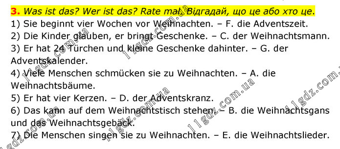 Was ist das? Wer ist das? Rate mal. Відгадай, що це або хто це. 1) Sie beginnt vier Wochen vor Weihnachten. – F. die Adventszeit. 2) Die Kinder glauben, er bringt Geschenke. – C. der Weihnachtsmann. 3) Er hat 24 Türchen und kleine Geschenke dahinter. – G. der Adventskalender. 4) Viele Menschen schmücken sie zu Weihnachten. – A. die Weihnachtsbäume. 5) Er hat vier Kerzen. – D. der Adventskranz. 6) Das kann auf dem Weihnachtstisch stehen. – B. die Weihnachtsgans und das Weihnachtsgebäck. 7) Die Menschen singen sie zu Weihnachten. – E. die Weihnachtslieder.
