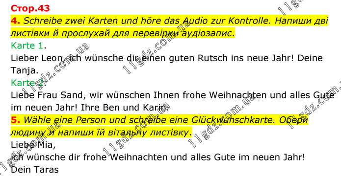 4. Schreibe zwei Karten und höre das Audio zur Kontrolle. Напиши дві листівки й прослухай для перевірки аудіозапис. Karte 1. Lieber Leon, ich wünsche dir einen guten Rutsch ins neue Jahr! Deine Tanja. Karte 2. Liebe Frau Sand, wir wünschen Ihnen frohe Weihnachten und alles Gute im neuen Jahr! Ihre Ben und Karin. 5. Wähle eine Person und schreibe eine Glückwunschkarte. Обери людину и напиши їй вітальну листівку. Liebe Mia, ich wünsche dir frohe Weihnachten und alles Gute im neuen Jahr! Dein Taras