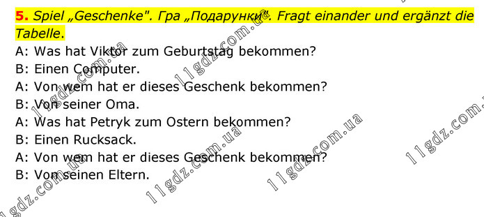Spiel „Geschenke". Гра „Подарунки". Fragt einander und ergänzt die Tabelle. А: Was hat Viktor zum Geburtstag bekommen? B: Einen Computer. А: Von wem hat er dieses Geschenk bekommen? В: Von seiner Oma. А: Was hat Petryk zum Ostern bekommen? B: Einen Rucksack. А: Von wem hat er dieses Geschenk bekommen? В: Von seinen Eltern.