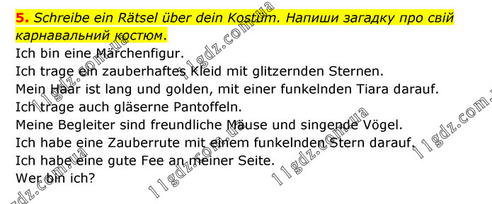Schreibe ein Rätsel über dein Kostüm. Напиши загадку про свій карнавальний костюм. Ich bin eine Märchenfigur. Ich trage ein zauberhaftes Kleid mit glitzernden Sternen. Mein Haar ist lang und golden, mit einer funkelnden Tiara darauf. Ich trage auch gläserne Pantoffeln. Meine Begleiter sind freundliche Mäuse und singende Vögel. Ich habe eine Zauberrute mit einem funkelnden Stern darauf. Ich habe eine gute Fee an meiner Seite. Wer bin ich?