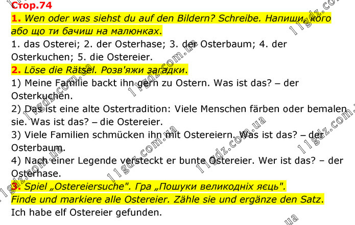 1. Wen oder was siehst du auf den Bildern? Schreibe. Напиши, кого або що ти бачиш на малюнках. 1. das Osterei; 2. der Osterhase; 3. der Osterbaum; 4. der Osterkuchen; 5. die Ostereier. 2. Löse die Rätsel. Розв'яжи загадки. 1) Meine Familie backt ihn gern zu Ostern. Was ist das? – der Osterkuchen. 2) Das ist eine alte Ostertradition: Viele Menschen färben oder bemalen sie. Was ist das? – die Ostereier. 3) Viele Familien schmücken ihn mit Ostereiern. Was ist das? – der Osterbaum. 4) Nach einer Legende versteckt er bunte Ostereier. Wer ist das? – der Osterhase. 3. Spiel „Ostereiersuche". Гра „Пошуки великодніх яєць". Finde und markiere alle Ostereier. Zähle sie und ergänze den Satz. Ich habe elf Ostereier gefunden.