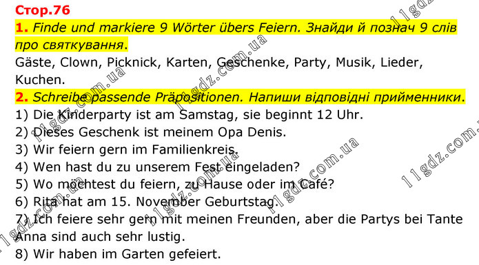 1. Finde und markiere 9 Wörter übers Feiern. Знайди й познач 9 слів про святкування. Gäste, Clown, Picknick, Karten, Geschenke, Party, Musik, Lieder, Kuchen. 2. Schreibe passende Präpositionen. Напиши відповідні прийменники. 1) Die Kinderparty ist am Samstag, sie beginnt 12 Uhr. 2) Dieses Geschenk ist meinem Opa Denis. 3) Wir feiern gern im Familienkreis. 4) Wen hast du zu unserem Fest eingeladen? 5) Wo möchtest du feiern, zu Hause oder im Café? 6) Rita hat am 15. November Geburtstag. 7) Ich feiere sehr gern mit meinen Freunden, aber die Partys bei Tante Anna sind auch sehr lustig. 8) Wir haben im Garten gefeiert.