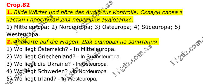 1. Bilde Wörter und höre das Audio zur Kontrolle. Склади слова з частин і прослухай для перевірки аудіозапис. 1) Mitteleuropa; 2) Nordeuropa; 3) Osteuropa; 4) Südeuropa; 5) Westeuropa. 2. Antworte auf die Fragen. Дай відповіді на запитання. 1) Wo liegt Österreich? - In Mitteleuropa. 2) Wo liegt Griechenland? - In Südosteuropa. 3) Wo liegt die Ukraine? - In Osteuropa. 4) Wo liegt Schweden? - In Nordeuropa. 5) Wo liegt Irland? - In Westeuropa.