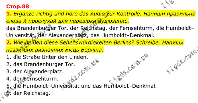 1. Ergänze richtig und höre das Audio zur Kontrolle. Напиши правильно слова й прослухай для перевірки аудіозапис. das Brandenburger Tor, der Reichstag, der Fernsehturm, die Humboldt–Universität, der Alexanderplatz, das Humboldt–Denkmal. 2. Wie heißen diese Sehenswürdigkeiten Berlins? Schreibe. Напиши назви цих визначних місць Берліна. 1. die Straße Unter den Linden. 2. das Brandenburger Tor. 3. der Alexanderplatz. 4. der Fernsehturm. 5. die Humboldt–Universität und das Humboldt–Denkmal. 6. der Reichstag.