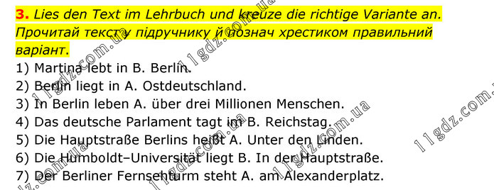 Lies den Text im Lehrbuch und kreuze die richtige Variante an. Прочитай текст у підручнику й познач хрестиком правильний варіант. 1) Martina lebt in B. Berlin. 2) Berlin liegt in A. Ostdeutschland. 3) In Berlin leben A. über drei Millionen Menschen. 4) Das deutsche Parlament tagt im B. Reichstag. 5) Die Hauptstraße Berlins heißt A. Unter den Linden. 6) Die Humboldt–Universität liegt B. In der Hauptstraße. 7) Der Berliner Fernsehturm steht A. am Alexanderplatz.