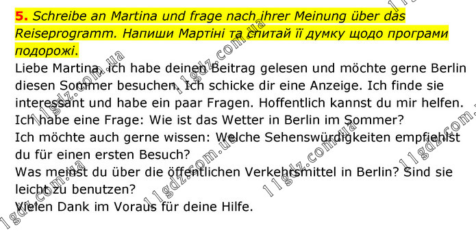 Schreibe an Martina und frage nach ihrer Meinung über das Reiseprogramm. Напиши Мартіні та спитай її думку щодо програми подорожі. Liebe Martina, ich habe deinen Beitrag gelesen und möchte gerne Berlin diesen Sommer besuchen. Ich schicke dir eine Anzeige. Ich finde sie interessant und habe ein paar Fragen. Hoffentlich kannst du mir helfen. Ich habe eine Frage: Wie ist das Wetter in Berlin im Sommer? Ich möchte auch gerne wissen: Welche Sehenswürdigkeiten empfiehlst du für einen ersten Besuch? Was meinst du über die öffentlichen Verkehrsmittel in Berlin? Sind sie leicht zu benutzen? Vielen Dank im Voraus für deine Hilfe.