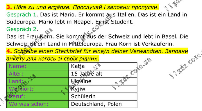 3. Höre zu und ergänze. Прослухай і заповни пропуски. Gespräch 1. Das ist Mario. Er kommt aus Italien. Das ist ein Land in Südeuropa. Mario lebt in Neapel. Er ist Student. Gespräch 2. Das ist Frau Korn. Sie kommt aus der Schweiz und lebt in Basel. Die Schweiz ist ein Land in Mitteleuropa. Frau Korn ist Verkäuferin. 4. Schreibe einen Steckbrief für eine/n deiner Verwandten. Заповни анкету для когось зі своїх рідних. Name: Katja Alter: 15 Jahre alt Land: Ukraine Wohnort: Kyjiw Beruf: Schülerin Wo was schon: Deutschland, Polen