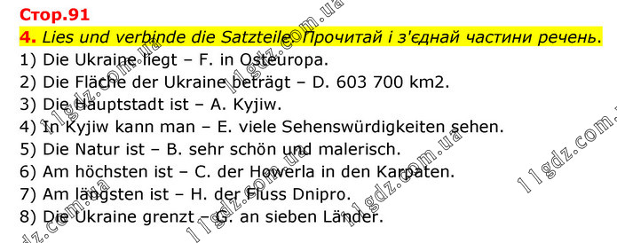 Lies und verbinde die Satzteile. Прочитай і з'єднай частини речень. 1) Die Ukraine liegt – F. in Osteuropa. 2) Die Fläche der Ukraine beträgt – D. 603 700 km2. 3) Die Hauptstadt ist – A. Kyjiw. 4) In Kyjiw kann man – E. viele Sehenswürdigkeiten sehen. 5) Die Natur ist – B. sehr schön und malerisch. 6) Am höchsten ist – C. der Howerla in den Karpaten. 7) Am längsten ist – H. der Fluss Dnipro. 8) Die Ukraine grenzt – G. an sieben Länder.