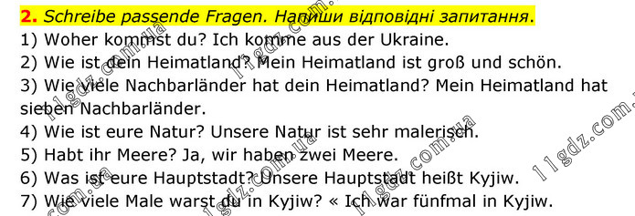 Schreibe passende Fragen. Напиши відповідні запитання. 1) Woher kommst du? Ich komme aus der Ukraine. 2) Wie ist dein Heimatland? Mein Heimatland ist groß und schön. 3) Wie viele Nachbarländer hat dein Heimatland? Mein Heimatland hat sieben Nachbarländer. 4) Wie ist eure Natur? Unsere Natur ist sehr malerisch. 5) Habt ihr Meere? Ja, wir haben zwei Meere. 6) Was ist eure Hauptstadt? Unsere Hauptstadt heißt Kyjiw. 7) Wie viele Male warst du in Kyjiw? « Ich war fünfmal in Kyjiw.