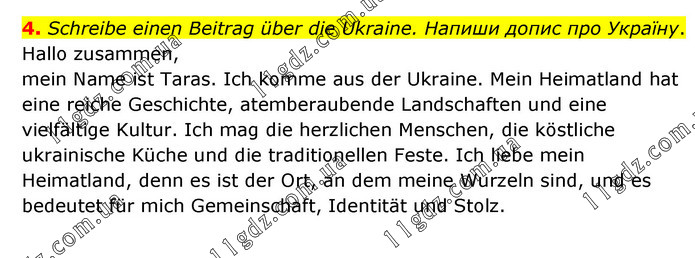 Schreibe einen Beitrag über die Ukraine. Напиши допис про Україну. Hallo zusammen, mein Name ist Taras. Ich komme aus der Ukraine. Mein Heimatland hat eine reiche Geschichte, atemberaubende Landschaften und eine vielfältige Kultur. Ich mag die herzlichen Menschen, die köstliche ukrainische Küche und die traditionellen Feste. Ich liebe mein Heimatland, denn es ist der Ort, an dem meine Wurzeln sind, und es bedeutet für mich Gemeinschaft, Identität und Stolz.