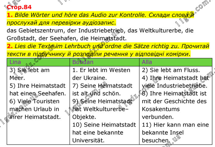 1. Bilde Wörter und höre das Audio zur Kontrolle. Склади слова й прослухай для перевірки аудіозапис. das Gebietszentrum, der Industriebetrieb, das Weltkulturerbe, die Großstadt, der Seehafen, die Heimatstadt. 2. Lies die Texte im Lehrbuch und ordne die Sätze richtig zu. Прочитай тексти в підручнику й розподіли речення у відповідні комірки. Lina Bohdan Alla 3) Sie lebt am Meer. 5) Ihre Heimatstadt hat einen Seehafen. 6) Viele Touristen machen Urlaub in ihrer Heimatstadt. 1. Er lebt im Westen der Ukraine. 7) Seine Heimatstadt ist alt und schön. 9) Seine Heimatstadt hat Weltkulturerbe–Objekte. 10) Seine Heimatstadt hat eine bekannte Universität. 2) Sie lebt am Fluss. 4) Ihre Heimatstadt hat viele Industriebetriebe. 8) Ihre Heimatstadt ist mit der Geschichte des Kosakentums verbunden. 11) Hier kann man eine bekannte Insel besuchen.