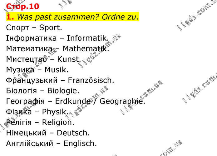 1. Was past zusammen? Ordne zu. Спорт – Sport. Інформатика – Informatik. Математика – Mathematik. Мистецтво – Kunst. Музика – Musik. Французький – Französisch. Біологія – Biologie. Географія – Erdkunde / Geographie. Фізика – Physik. Релігія – Religion. Німецький – Deutsch. Англійський – Englisch.