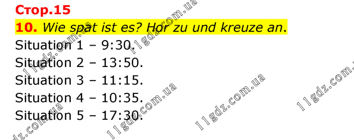 Wie spat ist es? Hor zu und kreuze an. Situation 1 – 9:30. Situation 2 – 13:50. Situation 3 – 11:15. Situation 4 – 10:35. Situation 5 – 17:30.