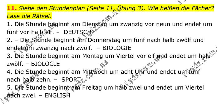 Siehe den Stundenplan (Seite 11, Übung 3). Wie heißen die Fächer? Lase die Rätsel. 1. Die Stunde beginnt am Dienstag um zwanzig vor neun und endet um fünf vor halb elf. – DEUTSCH 2. – Die Stunde beginnt am Donnerstag um fünf nach halb zwölf und endet um zwanzig nach zwölf. – BIOLOGIE 3. Die Stunde beginnt am Montag um Viertel vor elf und endet um halb zwölf. – BIOLOGIE 4. Die Stunde beginnt am Mittwoch um acht Uhr und endet um fünf nach halb zehn. – SPORT 5. Die Stunde beginnt am Freitag um halb zwei und endet um Viertel nach zwei. – ENGLISH