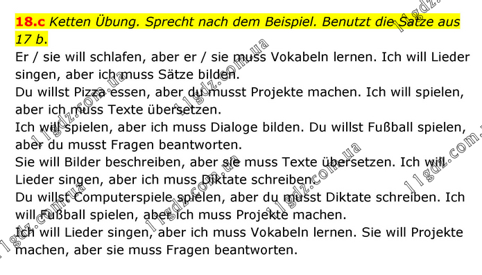 Ketten Übung. Sprecht nach dem Beispiel. Benutzt die Satze aus 17 b. Er / sie will schlafen, aber er / sie muss Vokabeln lernen. Ich will Lieder singen, aber ich muss Sätze bilden. Du willst Pizza essen, aber du musst Projekte machen. Ich will spielen, aber ich muss Texte übersetzen. Ich will spielen, aber ich muss Dialoge bilden. Du willst Fußball spielen, aber du musst Fragen beantworten. Sie will Bilder beschreiben, aber sie muss Texte übersetzen. Ich will Lieder singen, aber ich muss Diktate schreiben. Du willst Computerspiele spielen, aber du musst Diktate schreiben. Ich will Fußball spielen, aber ich muss Projekte machen. Ich will Lieder singen, aber ich muss Vokabeln lernen. Sie will Projekte machen, aber sie muss Fragen beantworten.