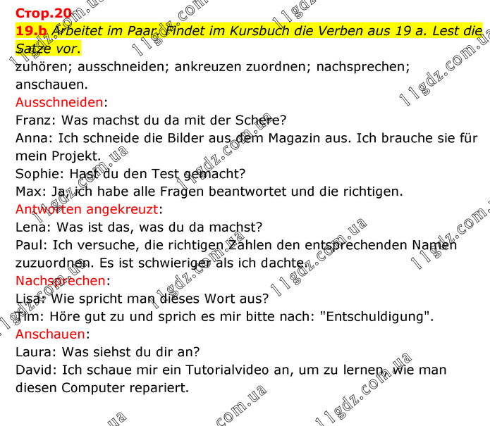 Arbeitet im Paar. Findet im Kursbuch die Verben aus 19 a. Lest die Satze vor. zuhören; ausschneiden; ankreuzen zuordnen; nachsprechen; anschauen. Ausschneiden: Franz: Was machst du da mit der Schere? Anna: Ich schneide die Bilder aus dem Magazin aus. Ich brauche sie für mein Projekt. Sophie: Hast du den Test gemacht? Max: Ja, ich habe alle Fragen beantwortet und die richtigen. Antworten angekreuzt: Lena: Was ist das, was du da machst? Paul: Ich versuche, die richtigen Zahlen den entsprechenden Namen zuzuordnen. Es ist schwieriger als ich dachte. Nachsprechen: Lisa: Wie spricht man dieses Wort aus? Tim: Höre gut zu und sprich es mir bitte nach: "Entschuldigung". Anschauen: Laura: Was siehst du dir an? David: Ich schaue mir ein Tutorialvideo an, um zu lernen, wie man diesen Computer repariert.