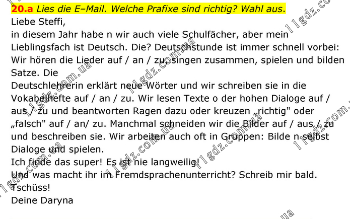 Lies die E–Mail. Welche Prafixe sind richtig? Wahl aus. Liebe Steffi, in diesem Jahr habe n wir auch viele Schulfächer, aber mein Lieblingsfach ist Deutsch. Die? Deutschstunde ist immer schnell vorbei: Wir hören die Lieder auf / an / zu, singen zusammen, spielen und bilden Satze. Die Deutschlehrerin erklärt neue Wörter und wir schreiben sie in die Vokabelhefte auf / an / zu. Wir lesen Texte o der hohen Dialoge auf / aus / zu und beantworten Ragen dazu oder kreuzen „richtig" oder „falsch" auf / an/ zu. Manchmal schneiden wir die Bilder auf / aus / zu und beschreiben sie. Wir arbeiten auch oft in Gruppen: Bilde n selbst Dialoge und spielen. Ich finde das super! Es ist nie langweilig! Und was macht ihr im Fremdsprachenunterricht? Schreib mir bald. Tschüss! Deine Daryna