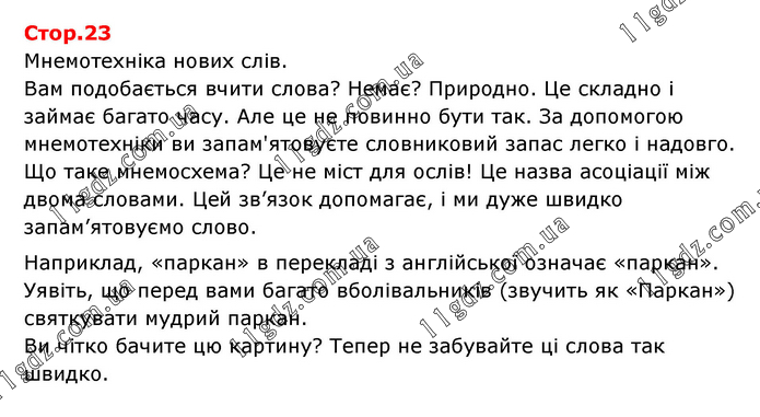 Мнемотехніка нових слів. Вам подобається вчити слова? Немає? Природно. Це складно і займає багато часу. Але це не повинно бути так. За допомогою мнемотехніки ви запам'ятовуєте словниковий запас легко і надовго. Що таке мнемосхема? Це не міст для ослів! Це назва асоціації між двома словами. Цей зв’язок допомагає, і ми дуже швидко запам’ятовуємо слово. Наприклад, «паркан» в перекладі з англійської означає «паркан». Уявіть, що перед вами багато вболівальників (звучить як «Паркан») святкувати мудрий паркан. Ви чітко бачите цю картину? Тепер не забувайте ці слова так швидко.